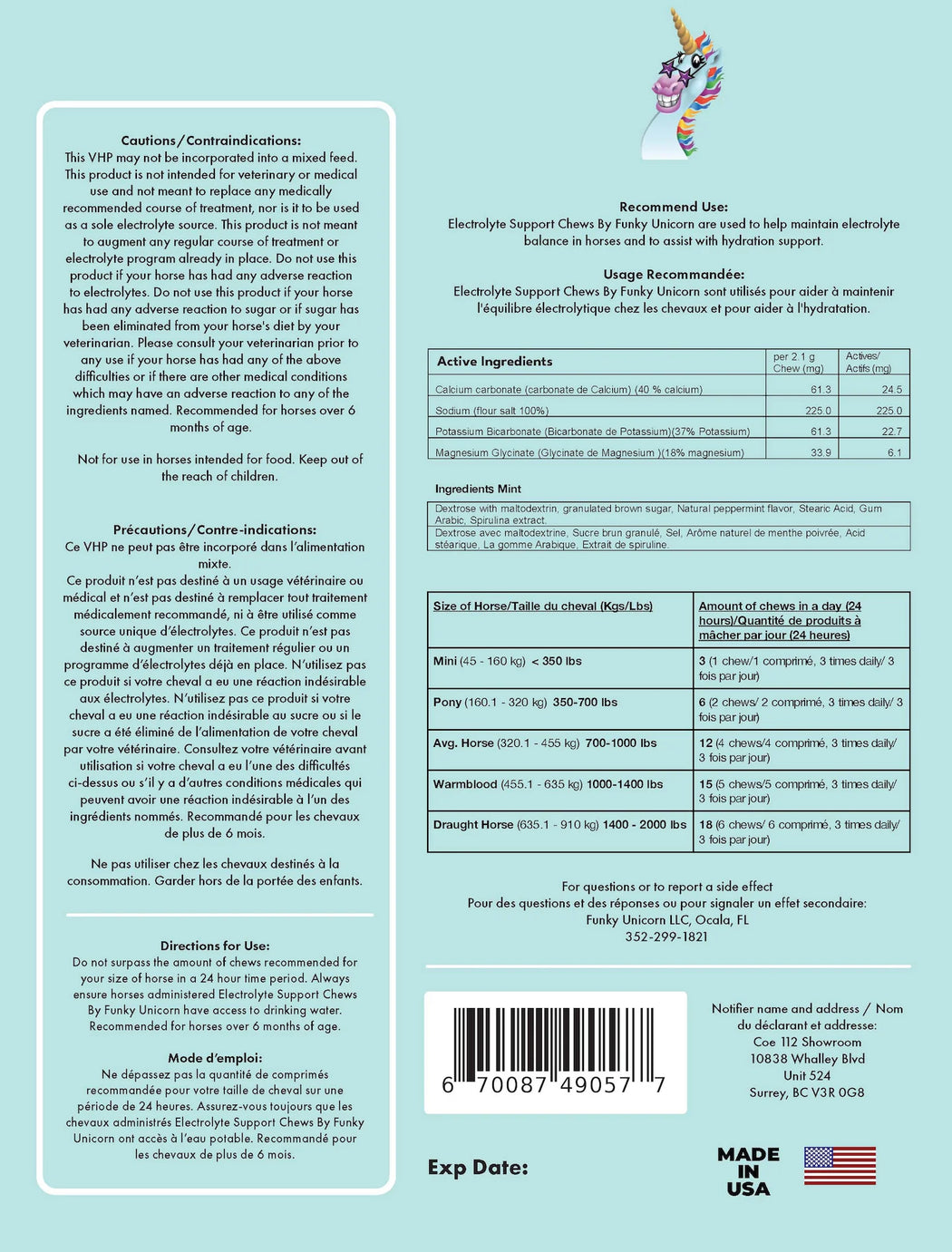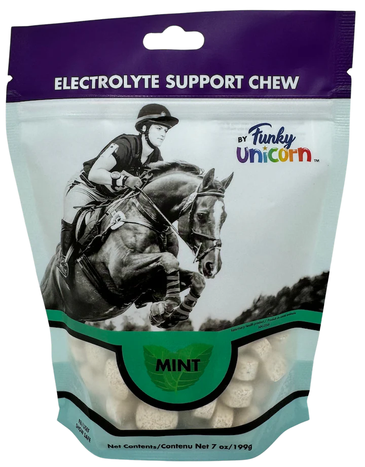 Funky Unicorn Electrolyte Support Chews are manufactured in a pharmaceutical facility to contain the precise amount of electrolytes in every single cube and are a mild electrolyte replacement. The Funky Unicorn Electrolyte Support Chews are not meant to replace a current electrolyte program and are perfect to be given when your horse needs them most to recover and hydrate so are convenient to have on hand.