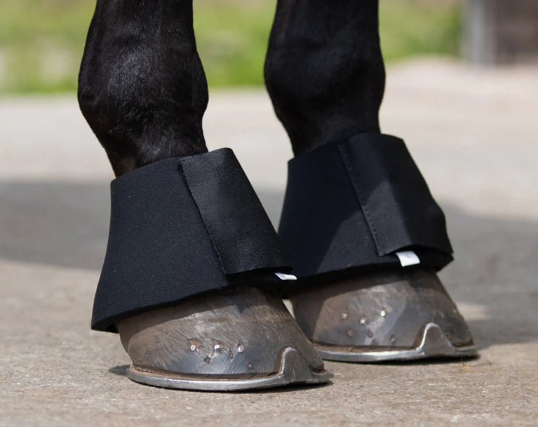 Basic bell boots made of thick neoprene. The bell boots protect the heel bulbs and prevent the horse shoes on the front hooves from being kicked off by the hind legs.