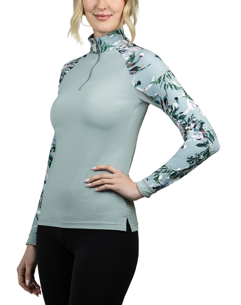 Contemporary sage green pairs back beautifully with our signature delicate blossom and foliage print. UPF 30, mesh sleeves, and soft 4-way stretch fabric in a contemporary fit.