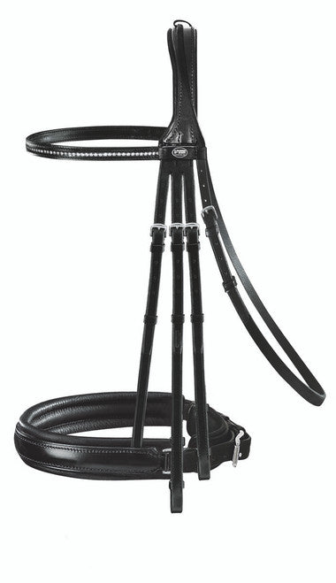 The Passier Fortuna Weymouth Bridle is particularly horse-friendly. The Fortuna Double Bridle has innovative, concealed elastic inserts that connect the softly padded crownpiece with the cheek-pieces and the noseband. The addition of these elastic inserts mean that pressure on the horse's poll is reduced and the horse's chewing activity is encouraged; riding in contact is much more pleasant on the sensitive horse's mouth and even tongue problems can be largely avoided. The exclusive Passier Fortuna Double Bridle also features a softly lined crank Caveson Special, flat hook stud ends, and an elegant browband with strass crystals. The Passier Fortuna Dressage Bridles comes with 2 sets of matching rubber-lined leather reins. Black with Stainless Steel fittings. Available in Cob, Full, and Oversize.